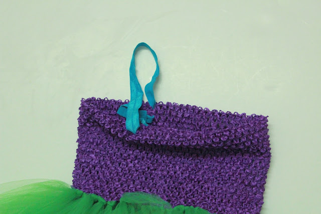 Cut out 3 pieces of tulle, each 30 inches long. Center them over the center of fold-over elastic strap and cinch them by tying them with a ribbon scrap. I also added some violet tulle just to add a touch of color.
